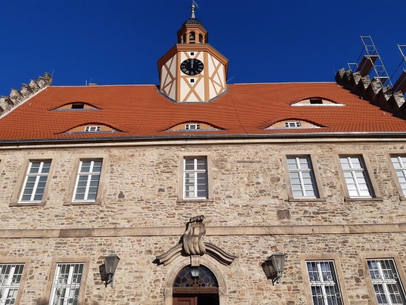 In einem ersten Bauabschnitt wird das Vorderhausdach mit dem Dachreiter denkmalgerecht erneuert. In dem Zusammenhang soll nun auch das mechanische Uhrwerk im Turm saniert und mit einer Funksteuerung ausgestattet werden. Die Baustelleneinrichtung ist bereits abgeschlossen. Abbrucharbeiten der Traufe von Hauptdach und Turm haben in dieser Woche begonnen. Für das Vorhaben, das mit rund 400 000 Euro veranschlagt ist, hatten der Salzlandkreis als Träger und der engagierte Förderverein des Salzlandmuseums recht ausgiebig nach Finanzierungsmöglichkeiten gesucht. Und am Ende breite Unterstützung gefunden.