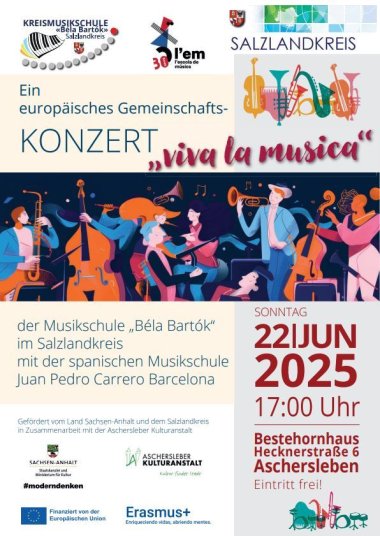 Dans le cadre de cette visite, les invités espagnols enrichiront dès la veille la "Fête de la musique", célébrée dans toute l'Europe, d'une contribution musicale à Aschersleben. Les places publiques se transforment en scène et la nuit la plus courte de l'année est entièrement placée sous le signe de la musique dans le Salzlandkreis, grâce aux organisateurs Aschersleber Kulturanstalt et Kunstquartier Grauer Hof.