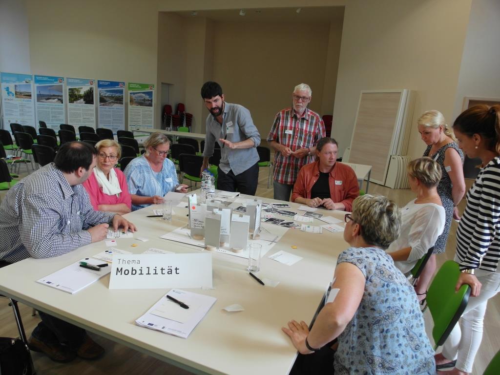 Nach einer kurzen Stärkung startete die Workshop-Phase. Zu den genannten Themen sollten verschiedene Ansätze entwickelt werden. Dies geschah aber auf eine ungewöhnliche Weise. Die Teilnehmer betrachteten die Problemstellungen nicht aus ihrer eigenen Sicht heraus, sondern schlüpften in die Rolle eines themenrelevanten Akteurs. So war es durchaus möglich, dass ein Bürgermeister zum Lebensmittelhändler wurde, Ideen aus dieser neuen Funktion heraus entwickeln und seinen eigenen Hintergrund ausblenden musste. Anfangs noch zögerlich, nahm die Diskussion schnell Fahrt auf und es entwickelten sich angeregte Gespräche. Die Teilnehmer konnten einen Blick über den Tellerrand werfen und ohne Rücksicht auf vorhandene Hierarchien auf Augenhöhe miteinander diskutieren. Aus der spielerischen Entwicklung von Ideen kam es so schnell zu einer Übertragung auf die Realität. Die Teilnehmer waren so gefesselt, dass trotz der