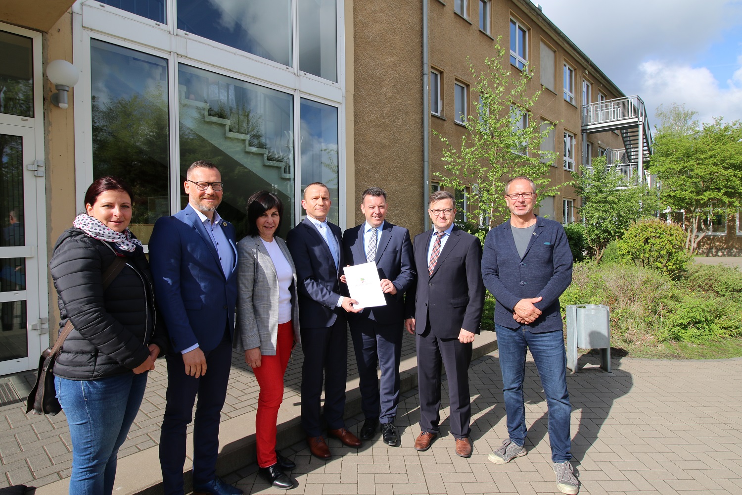 V.l.: Katja Huster vom Fachdienst Bauordnung und Hochbau, Fachbereichsleiter für Bildung, Familie und Soziales Mathias Kiegeland, Schulleiterin der Gemeinschaftsschule "Albert Schweitzer" Katrin Jelitte, stellvertretender Landrat Thomas Michling, Sachsen-Anhalts Finanzminister André Schröder, der Landtagsabgeordnete Detlef Gürth und der Fachdienstleiter für Bildung und Amt für Ausbildungsförderung Ulf-Peter Freund