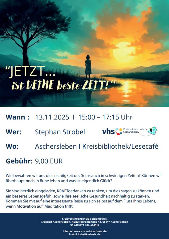 Aschersleben. In seinem Veranstaltungen möchte der selbständige Alltagsbegleiter und Glücksexperte Stephan Strobel aus Aschersleben Optimismus verbreiten und ein positives Lebensgefühl fördern. Das will auch die KVHS und hat ihn als Kursleiter gewonnen, denn, sind wir mal ehrlich, Optimismus und Positivität fallen in der heutigen Zeit nicht immer leicht. Interessierte sind am 13. November, 15 Uhr herzlich eingeladen in das Lesecafé der Kreisbibliothek zu „Jetzt... ist DEINE beste Zeit!“, einem Impulsvortrag mit dem Ascherslebener Glücksexperten. Dabei können sie seine Ratschläge hören und in gemütlicher Runde miteinander ins Gespräch kommen. Bestenfalls tanken sie Kraftgedanken, die im Alltag helfen für ein positives Lebensgefühl.