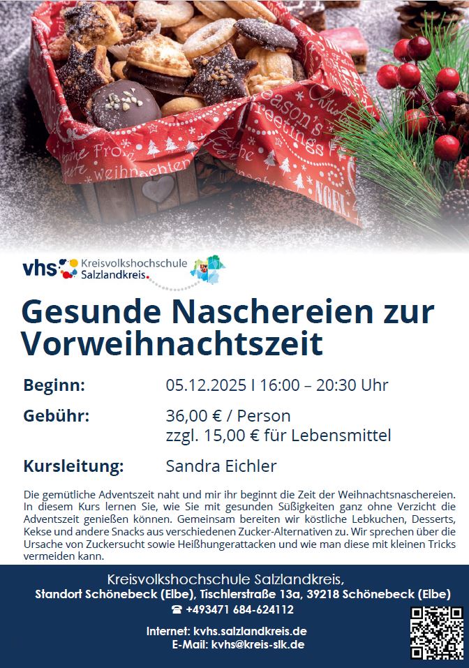 Nähere Informationen zu den einzelnen Kursen online oder telefonisch unter +49 3471 684-624014 (Aschersleben) und +49 3471 684-624114 (Schönebeck). Bitte vorher anmelden! Internet: kvhs.salzlandkreis.de.
