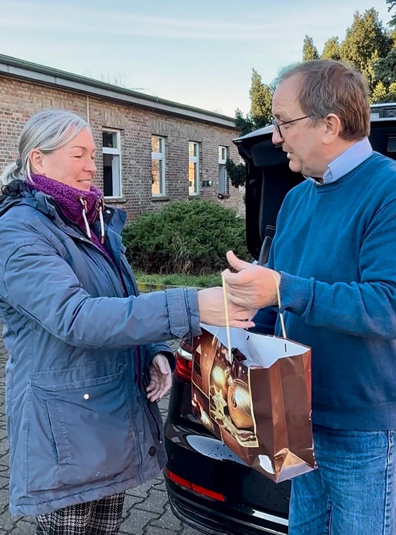 Landrat Markus Bauer (r.) übergibt Tierheimleiterin Rasa Zacharias eine vorweihnachtliche Aufmerksamkeit als Zeichen der Anerkennung. Bildquelle: Tom Gräbe / Salzlandkreis